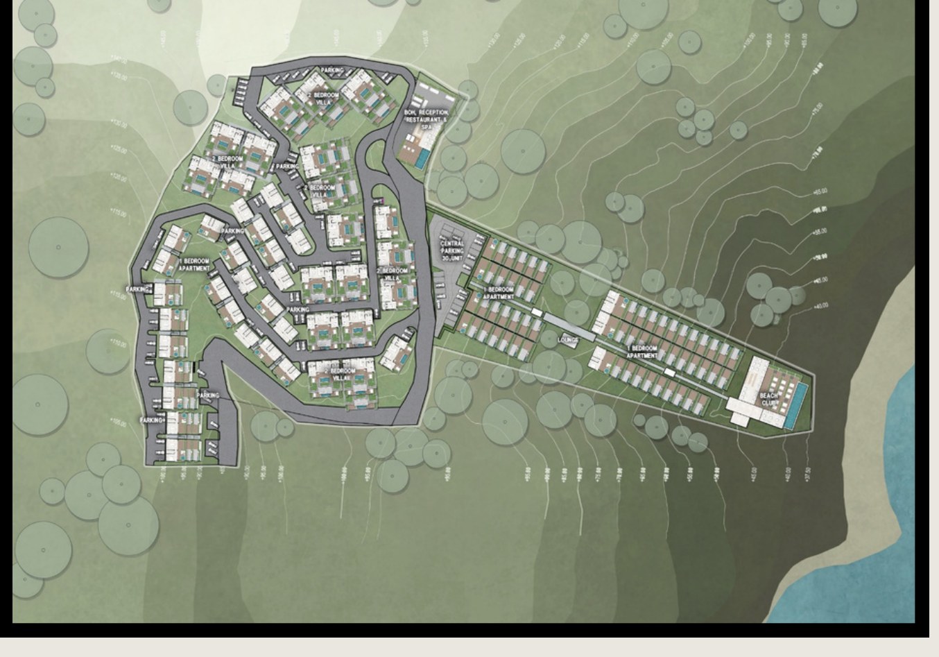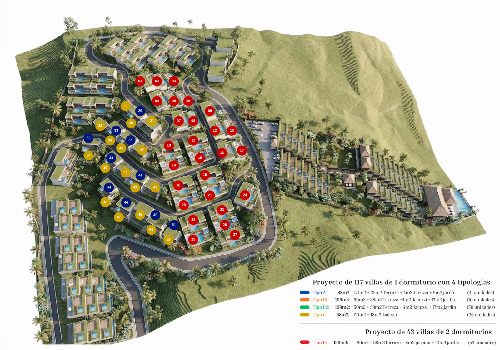 Un resort en ladera entre Kuta y Areguling (Central Lombok), a ~5 minutos del centro. Desarrollo de 26.685 m² con villas de 1 y 2 dormitorios (piscinas privadas), Beach Club, Wellness & Spa y restaurantes. Proyecto provisional sujeto a ajustes.